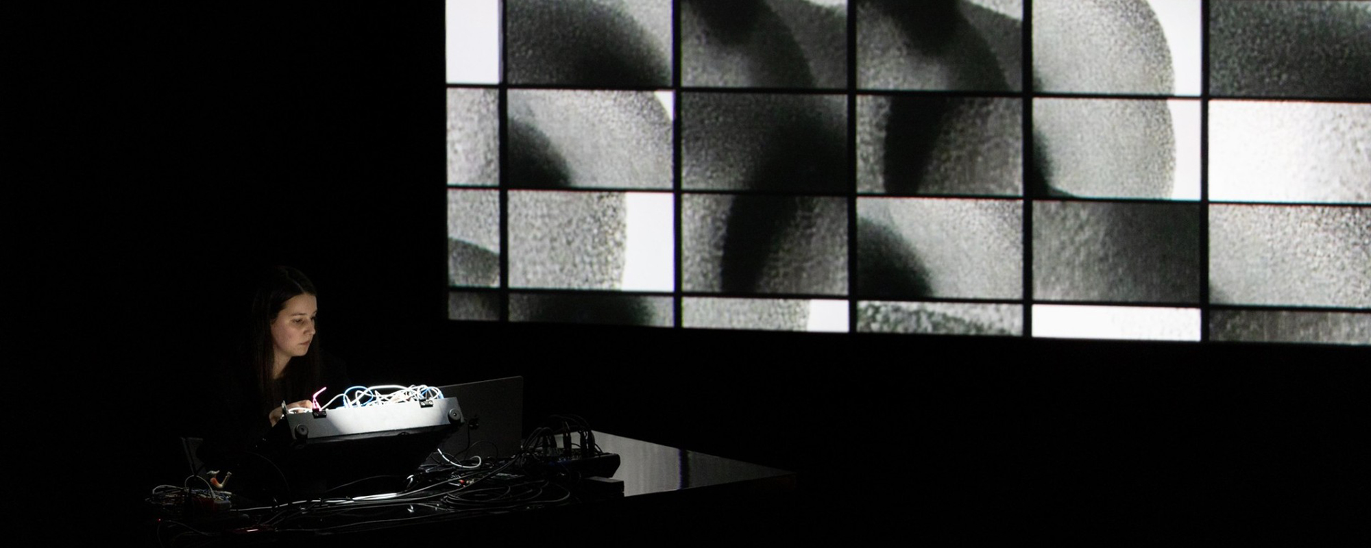 Small gestures trigger shifting frequencies, layered tones, and evolving textures. The performance unfolds as a delicate choreography of presence and pressure, where the body becomes both conductor and sensor. Live visuals generated directly from her instruments respond in real time, extending the sonic environment into a fully immersive, multi-sensory experience.